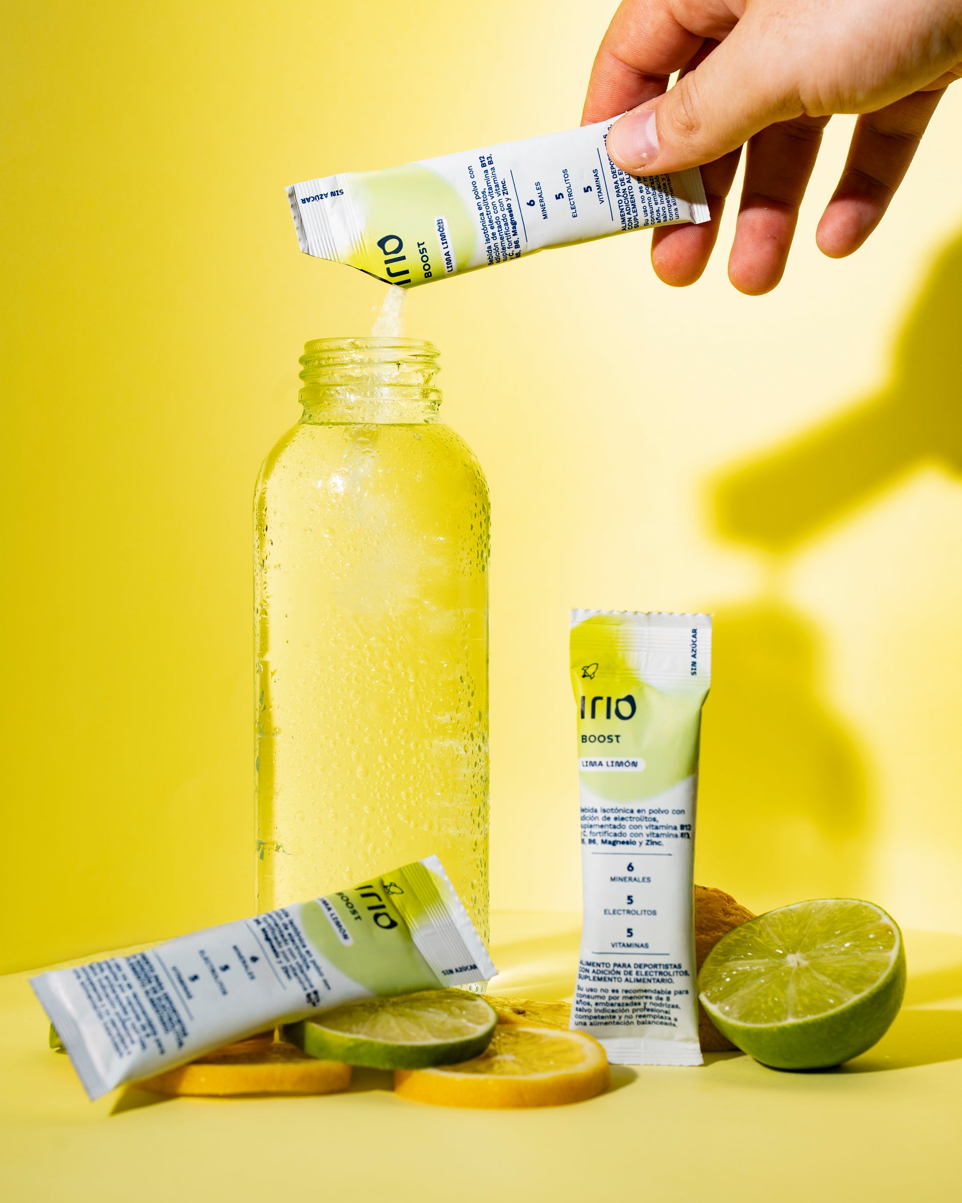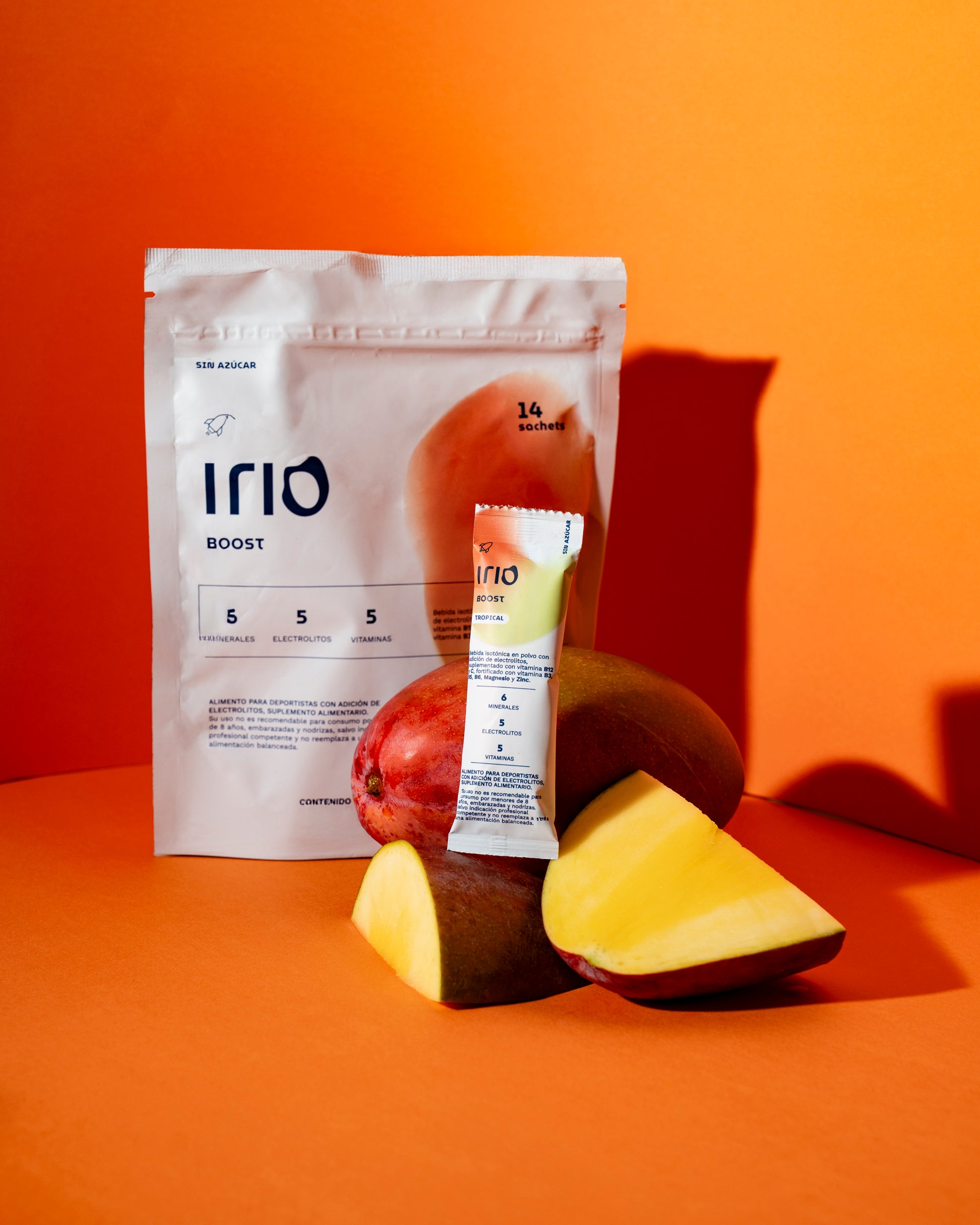 - Disuelve 1 sobre de Irio Boost en 500 ml de agua.