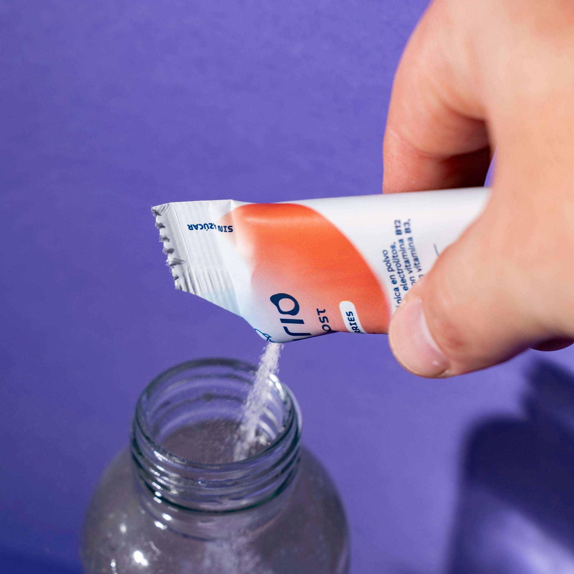 - Disuelve 1 sobre de Irio Boost en 500 ml de agua.